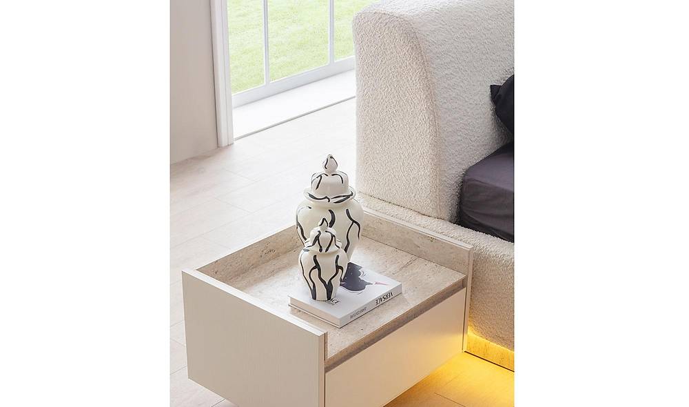 Opbergbed voor matrasmaat 160x200 in zachte ekru met travertin-print, ontworpen voor stijlvolle functionaliteit. Ideaal voor wie maximale opbergruimte wil combineren met een luxe, onderhoudsarme uitstraling.