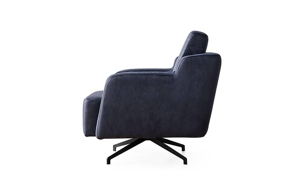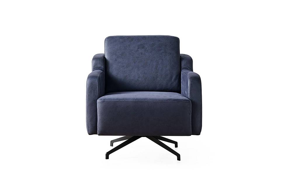 Moderne draaibare berjer bekleed met luxueuze nubukstof en een stevig houten skelet. De middelharde zit en het 360° draaimechanisme bieden comfort en maximale flexibiliteit in elke woonkamer.