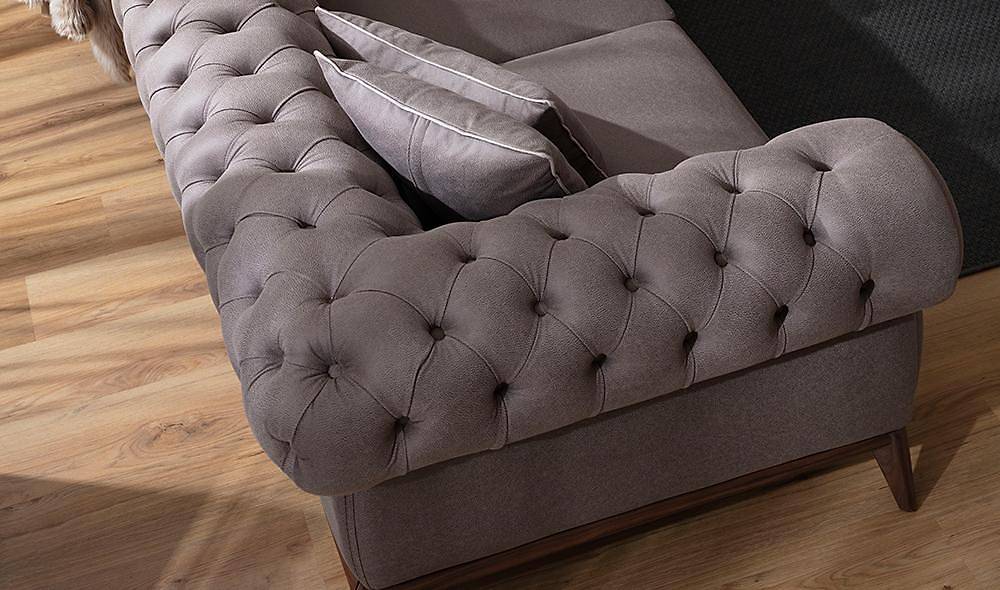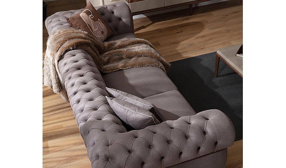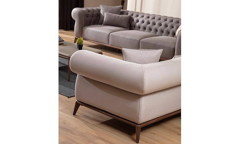 Complete zitcombinatie met twee banken en één fauteuil, waarvan één in chesterfield‑vorm. Perfect voor wie zachte zit, hoogwaardige materialen en aanpasbare stofkleur wil combineren.