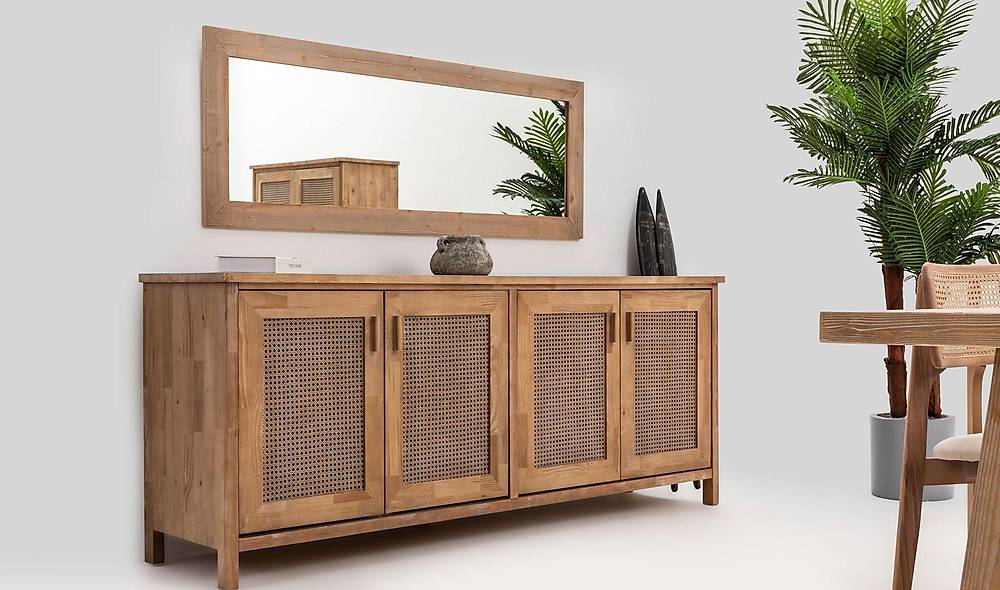 - Voegt ruime opbergruimte toe met vierdeursconsole en spiegel