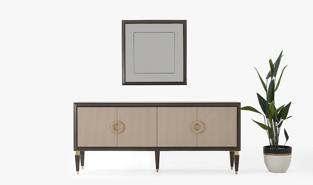 - Praktische opbergruimte: een geconstrueerde console met vier deuren en planken houdt uw servies en accessoires netjes geordend.