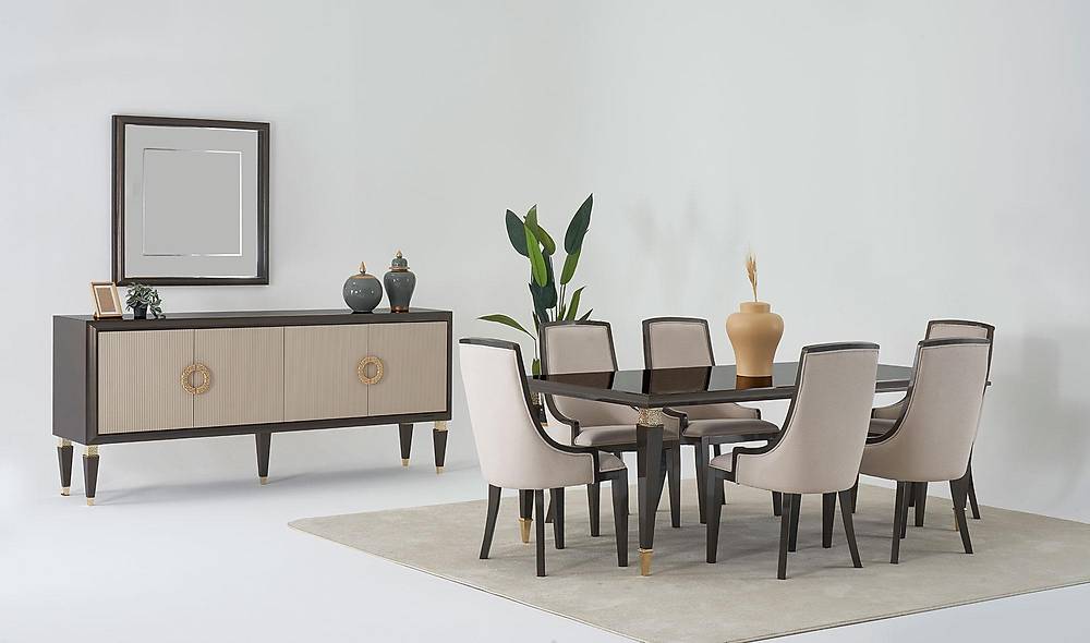 Complete eetkameropstelling met console en spiegel, vaste eetkamertafel en zes comfortabele stoelen. Perfecte keuze voor wie waarde hecht aan tijdloze uitstraling en duurzame materialen.