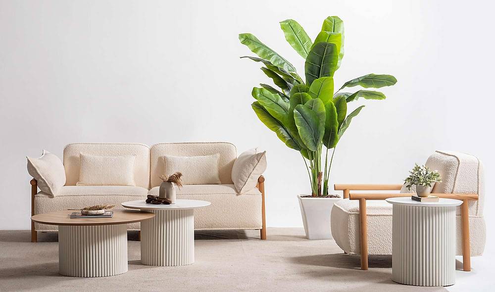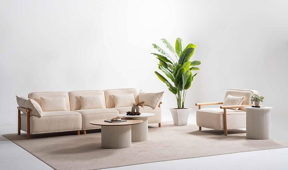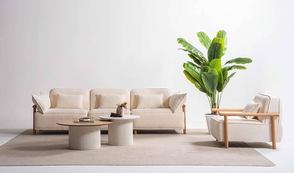 - Luxe uitstraling: de bouclé-stof voelt zacht aan en geeft een moderne, tijdloze look die gemakkelijk te combineren is met verschillende interieurstijlen. De stof is in kleur aan te passen, zodat je de set personaliseert naar jouw smaak.