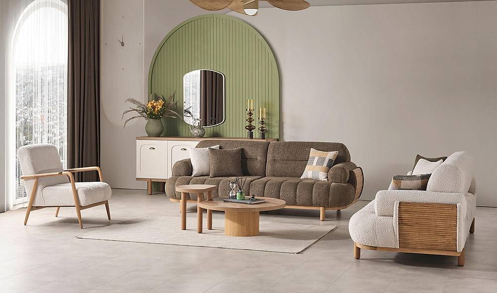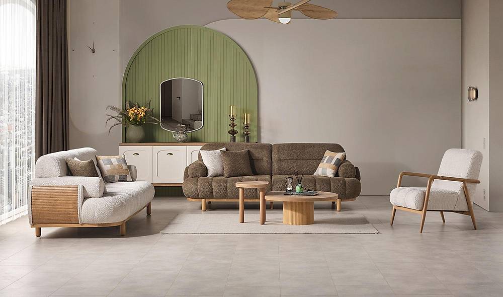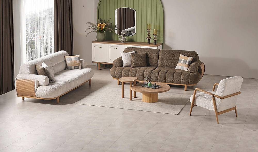 - Setopbouw: twee banken en één fauteuil — speels en compleet, zonder salontafels (niet inbegrepen).