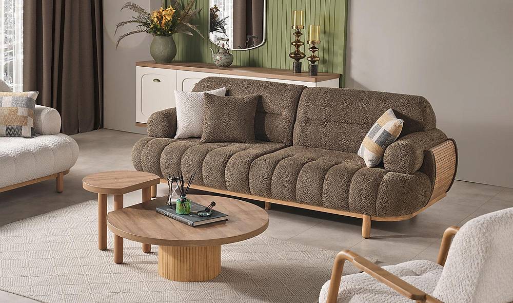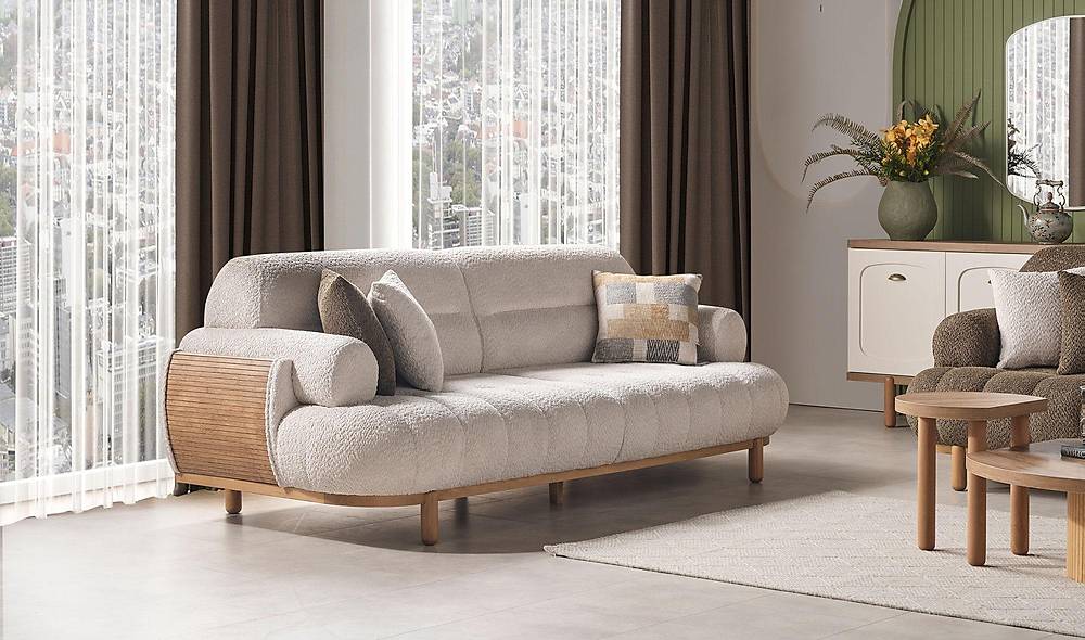 Multifunctionele slaapbankset met twee zitbanken en een bijpassende fauteuil, ideaal voor compacte woonruimtes. Perfect voor wie gasten ontvangt, dankzij de snelle slaapfunctie en aanpasbare, zacht gestructureerde stof.