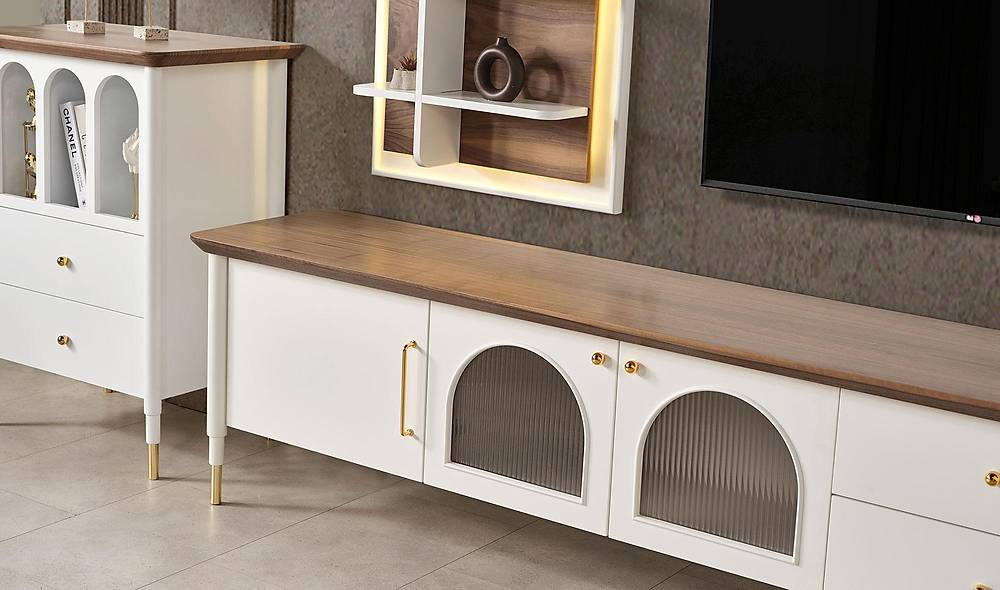 - Dressoir: 3-deurs design met lades en stoppermechanismen voor veilige, geruisloze bediening.
