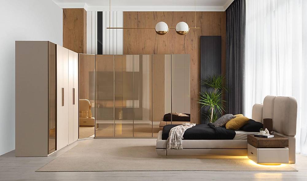 - Praktische opbergoplossing in één: het bijbehorende kastenpaneel bevat zowel hanggedeelte, planken als lades — een complete garderobe-oplossing geïntegreerd in uw slaapruimte.