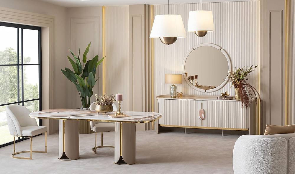Beeld je avonden vol samenzijn in: een warme, stijlvolle eetkamer waar design en functionaliteit samenkomen. Dit complete eetkamerset van French Door Art combineert een verfijnde crème kleur met marmer-effect details voor een luxe uitstraling — zonder het gedoe van kwetsbaar natuursteen. Gemaakt van hoogwaardige, geverfde MDF en stevige hout- en metalen accenten, biedt dit meubelstuk zowel schoonheid als gebruiksgemak voor dagelijks leven.