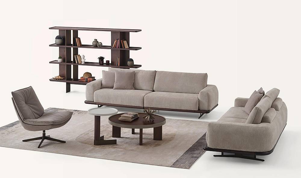- Inclusief twee zitbanken plus één draaibare berjer; bijzettafels niet inbegrepen