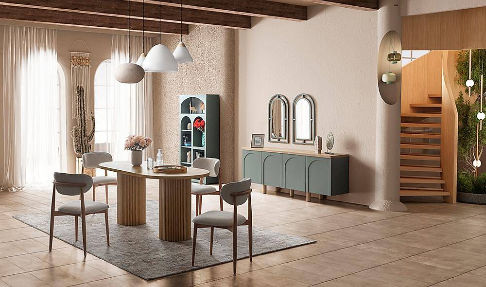 - Complete oplossing: de set bevat dressoir met spiegel, eetkamertafel en 6 stoelen — een kant-en-klare make-over voor je eetruimte. Optionele tv‑unit en salontafel zijn verkrijgbaar maar niet inbegrepen.