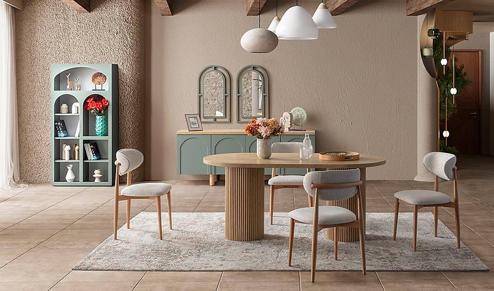 - Duurzame kwaliteit: zorgvuldig gekozen materialen—geverfde MDF-frontpanelen met stevige spaanplaatinterieurs, massief houten poten en een gürgen (beuken) stoelstructuur—zorgen voor jarenlange betrouwbaarheid.