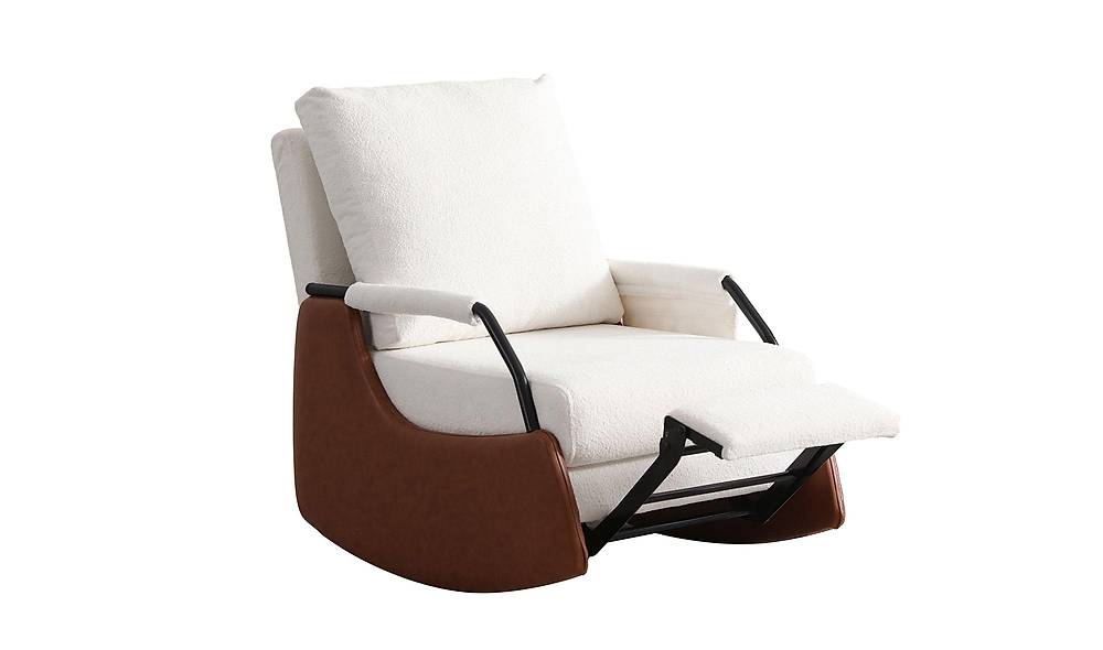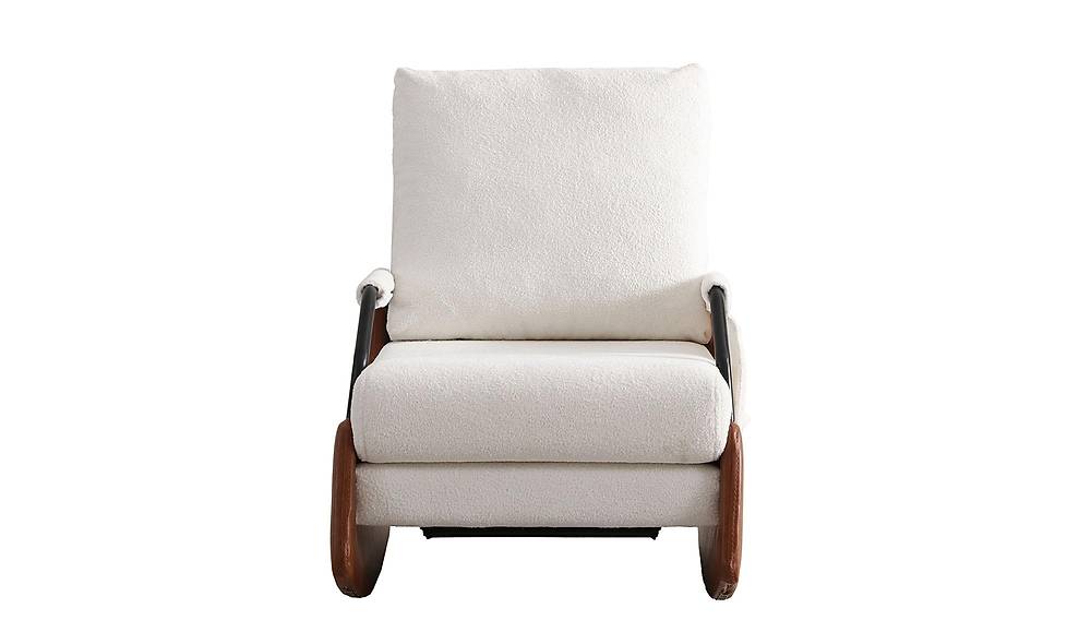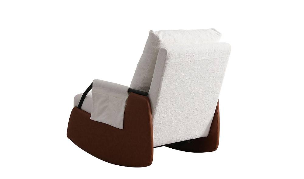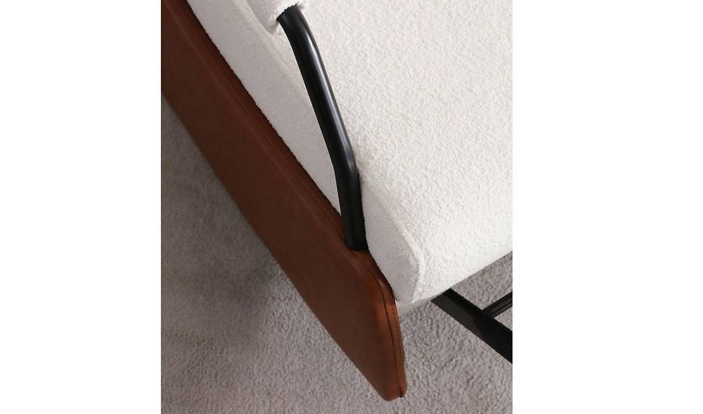 Moderne fauteuil met zachte zitting en elegante houten accenten, uitgevoerd in een mix van kunstleer en boucle. Perfect voor wie comfortabel zitcomfort wil combineren met een aanpasbare, stijlvolle look.