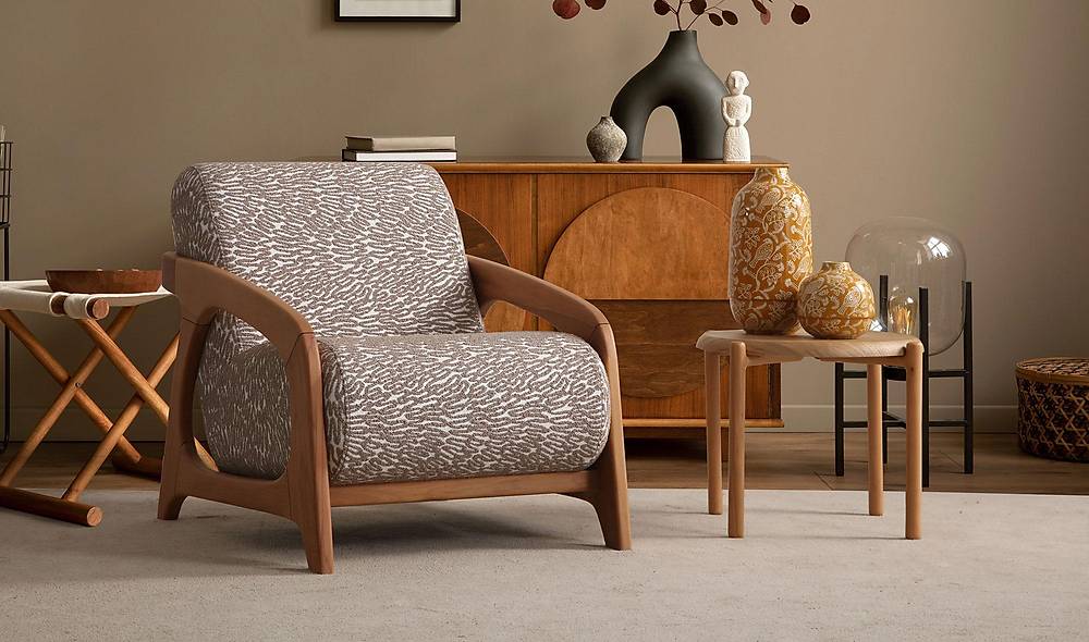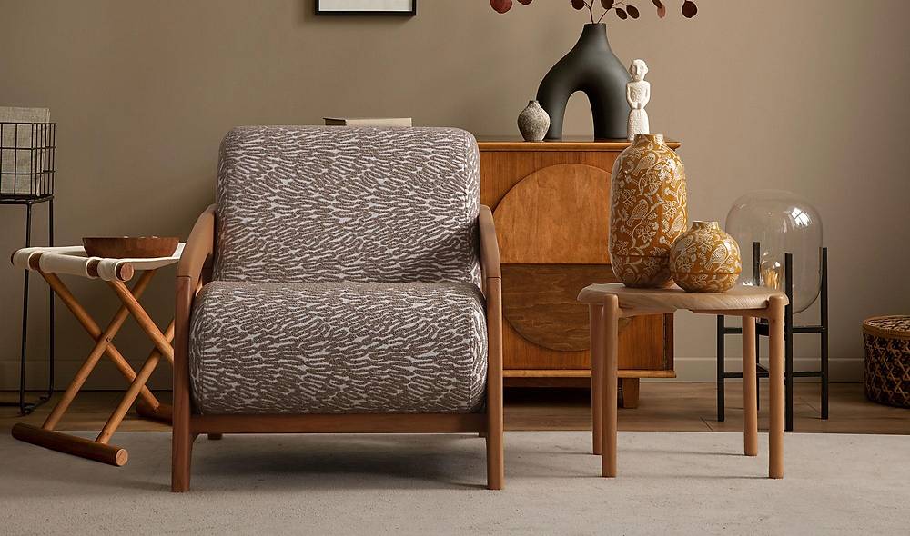 Een modern zitmeubel dat stijl en dagelijks comfort combineert. De aanpasbare nubuck-stof en stevige beukenhouten constructie zorgen voor uitstraling en langdurige ondersteuning.