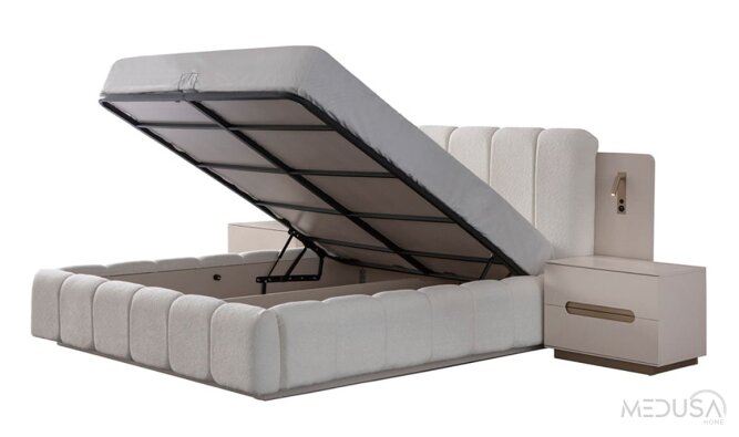 Ervaar het ultieme slaapcomfort: een elegant en duurzaam bed bekleed met 1e-klas stof dat rust en luxe in uw slaapkamer brengt. Dit bed combineert hoogwaardige afwerking, slimme functionaliteit en tijdloos design — perfect voor wie kwaliteit niet aan het toeval overlaat.