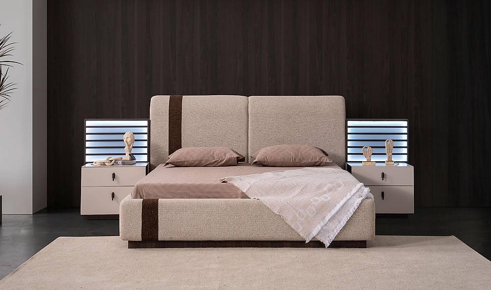 - Materiaal: spaanplaat (yonga levha) met zachte, geweven stof op het hoofdeind.