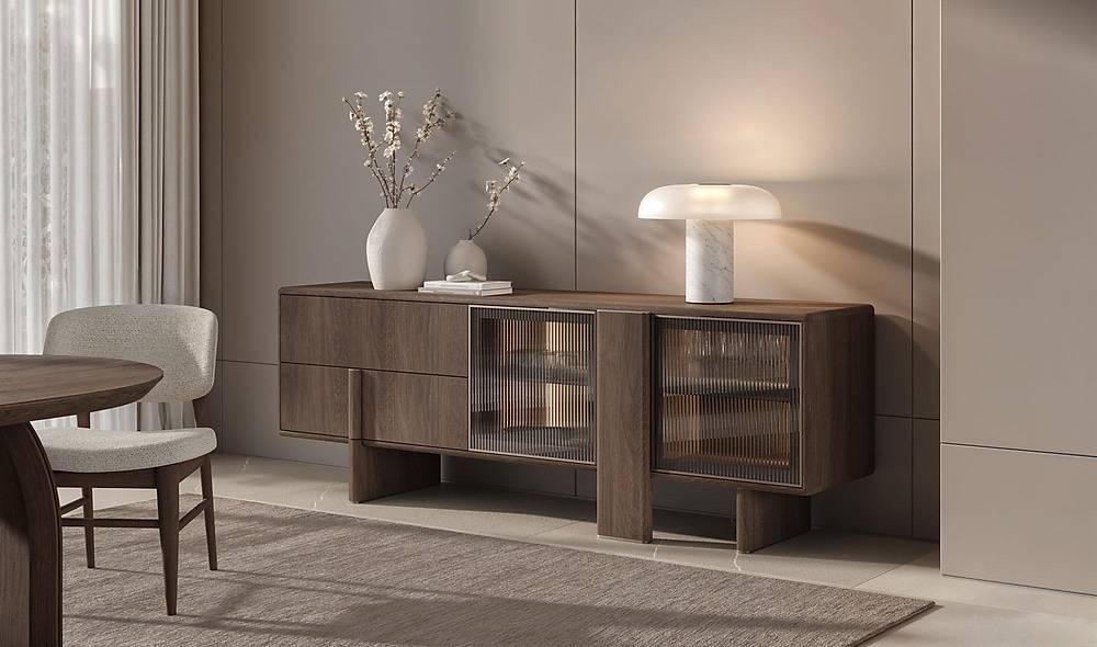 Onderhoud en gebruikHet onderhoud is eenvoudig: een vochtig doekje is voldoende om het houtfineer en de bekleding fris te houden. Gebruik geen agressieve schoonmaakmiddelen om de afwerking en textuur te beschermen. De deurstoppers op de console voorkomen dat de deuren hard dichtslaan en verlengen de levensduur van het meubel.