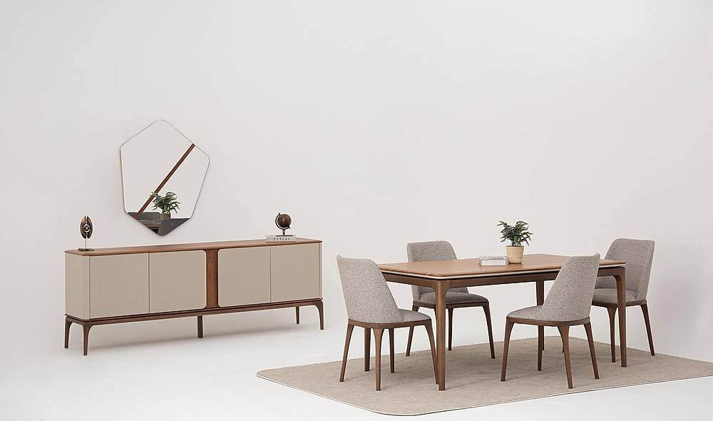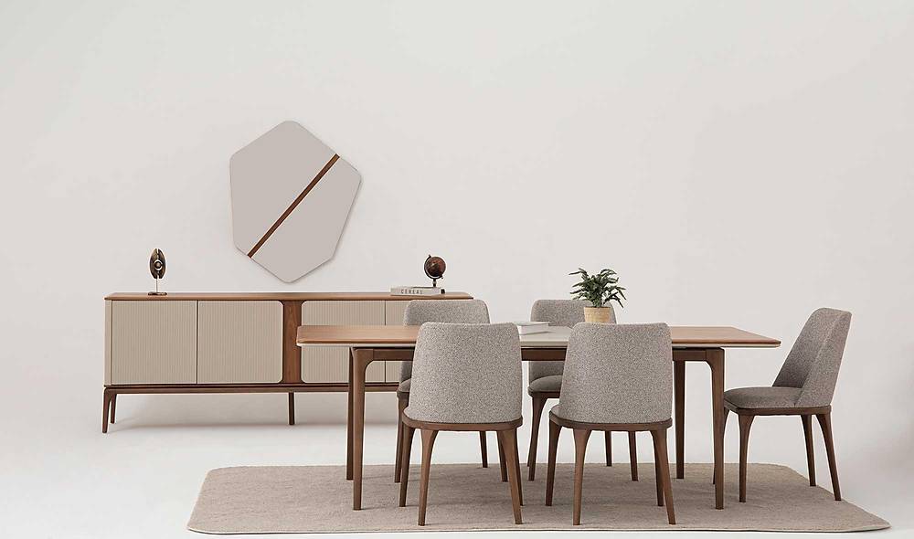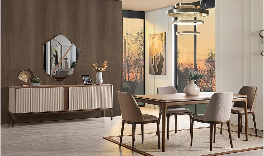 Stijlvolle cappuccino eetkamer set met tafel, zes stoelen en een vierdeurige console met spiegel. Ideaal voor wie elegant design wil combineren met comfort en praktische opbergruimte.