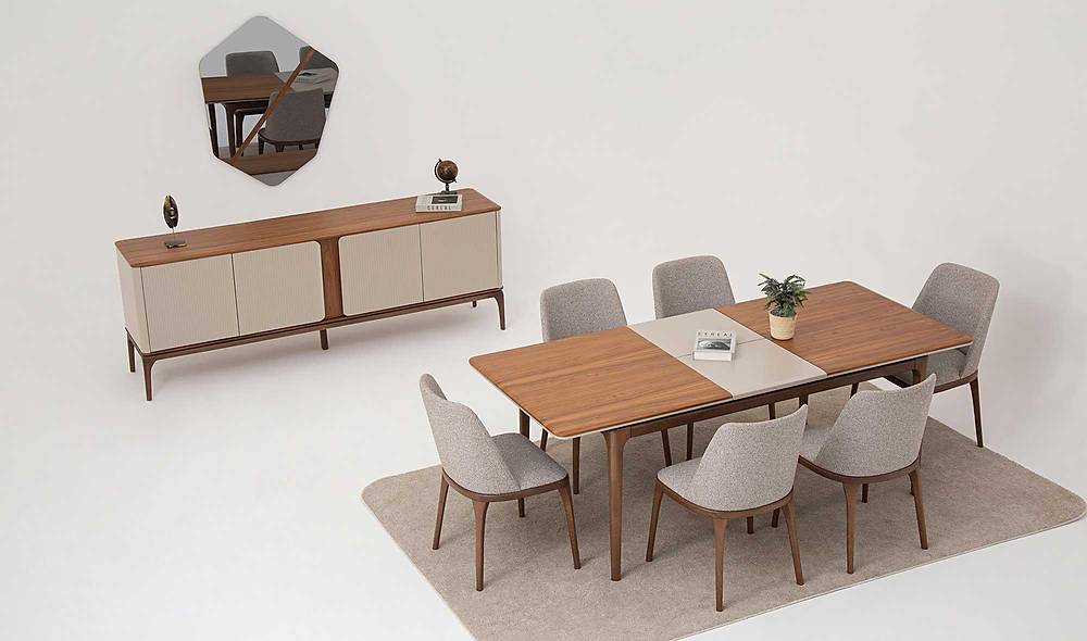 - Complete set voor gezins- en feestmomenten: een ruime eetkamertafel die van het midden opent, zes comfortabele stoelen, plus een stijlvolle console met spiegel en ruime opbergruimte.
