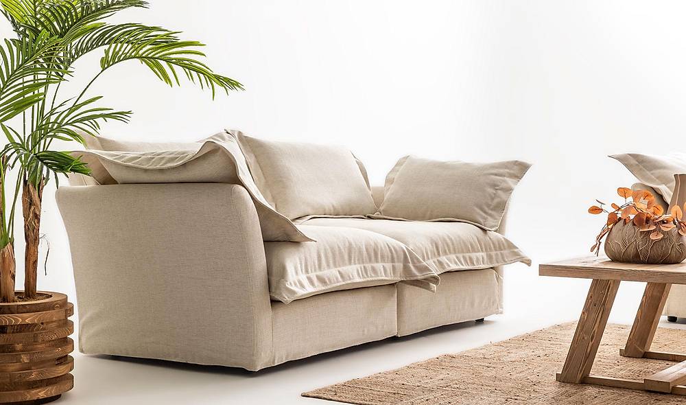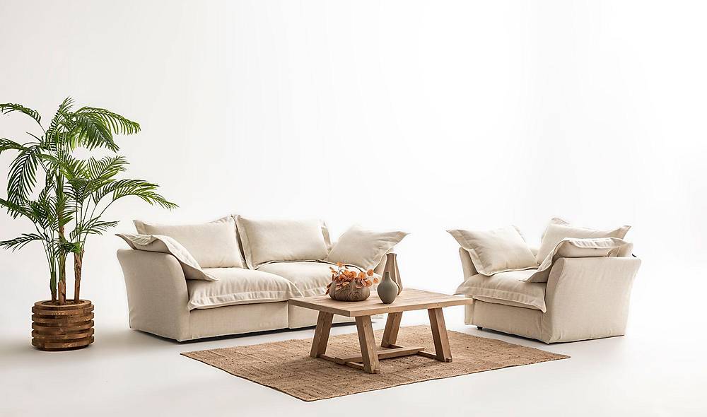 Comfortabel bankstel bestaande uit een 2-zitsbank en bijpassende fauteuil. Perfect voor wie een zachte zit wil met aanpasbare linnenbekleding voor een naadloze interieurmatch.