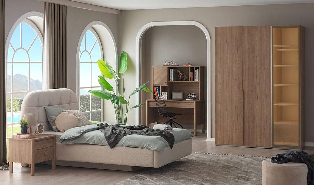 Complete slaapkamerset met bed, hoofdeinde, kledingkast en bureau in warme walnootkleur. Ideaal voor wie slimme opberging wil, dankzij geïntegreerde LED-verlichting en doordachte indeling.