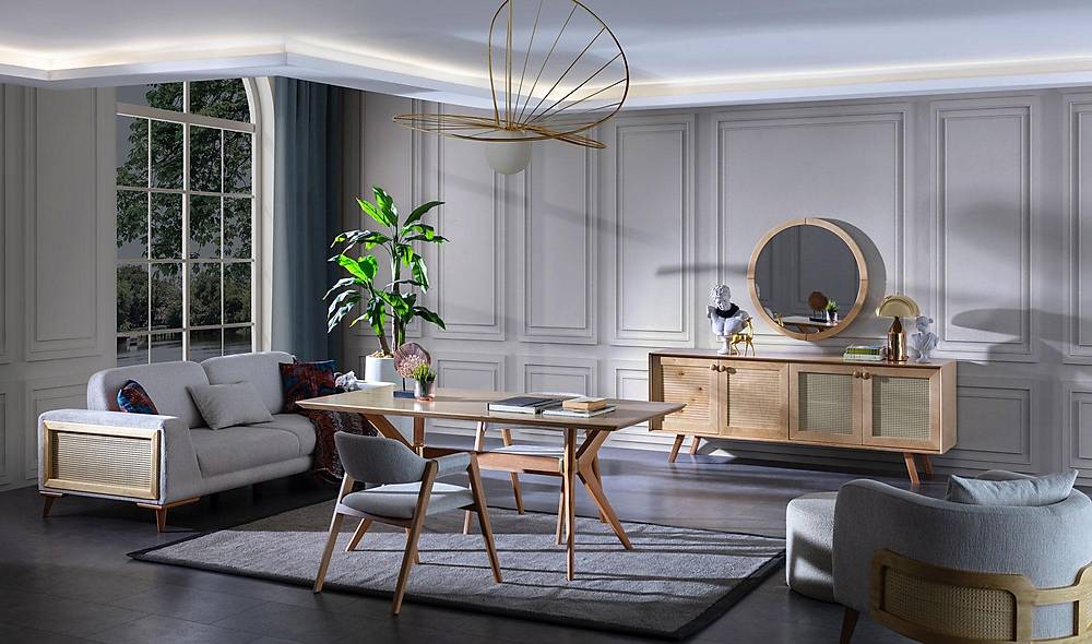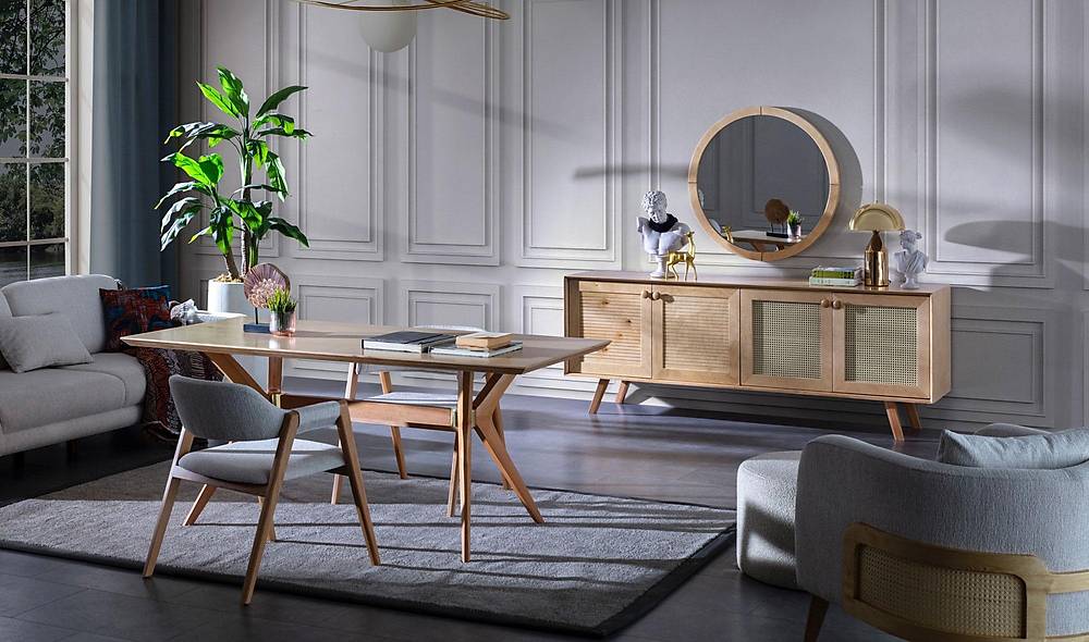 Wat je krijgtDeze complete set is ontworpen als centraal punt in je eetruimte: een ruime eetkamertafel, zes comfortabele stoelen en een stijlvolle console met spiegel. Optionele items zoals een tv-unit en salontafel zijn beschikbaar maar niet inbegrepen.