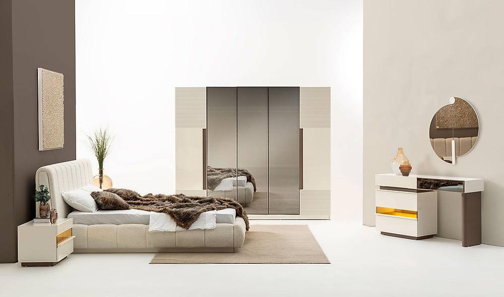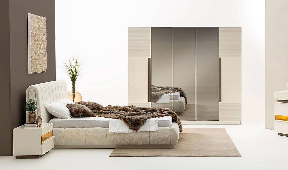 - Verfraait de slaapkamer met geweven bekleding en spiegelgedeelten.