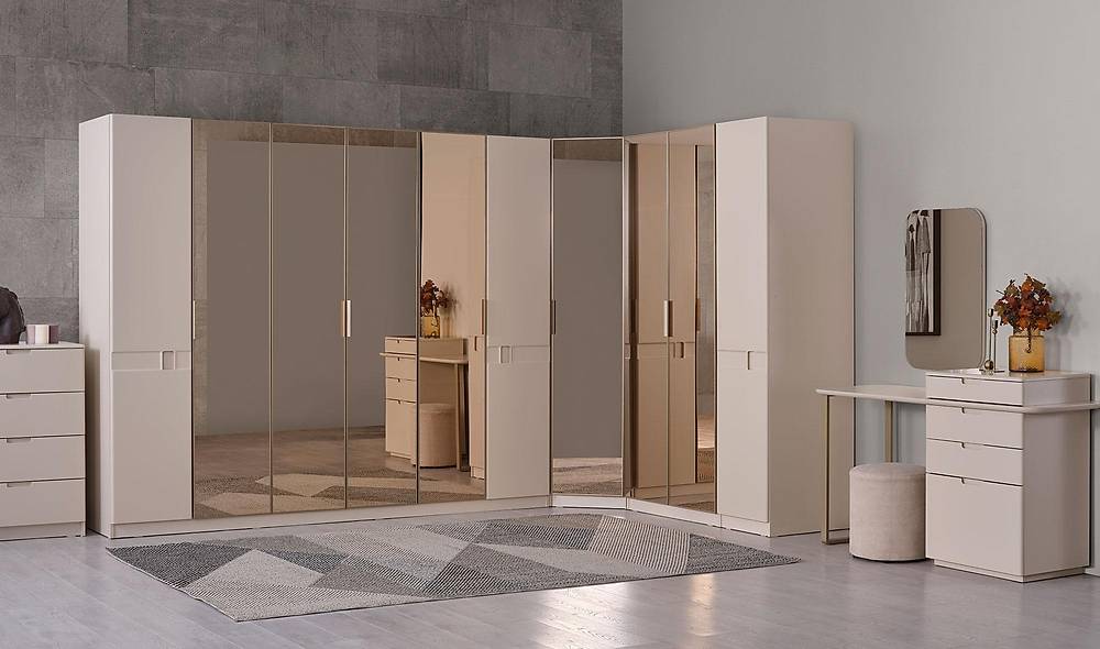 - Scandinavisch-geïnspireerde beige uitvoer geeft rust en warmte, terwijl het bronskleurige spiegelpaneel in de kast een vleugje luxe toevoegt.