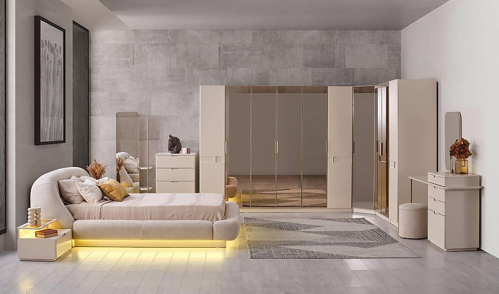 Stijlvolle beige slaapkameroplossing: een opbergbed gecombineerd met een functionele kledingkast, voorzien van bronzen spiegel en LED-verlichting. Ideaal voor wie ruimte wil besparen met slimme opbergmogelijkheden en een hoogwaardige uitstraling.