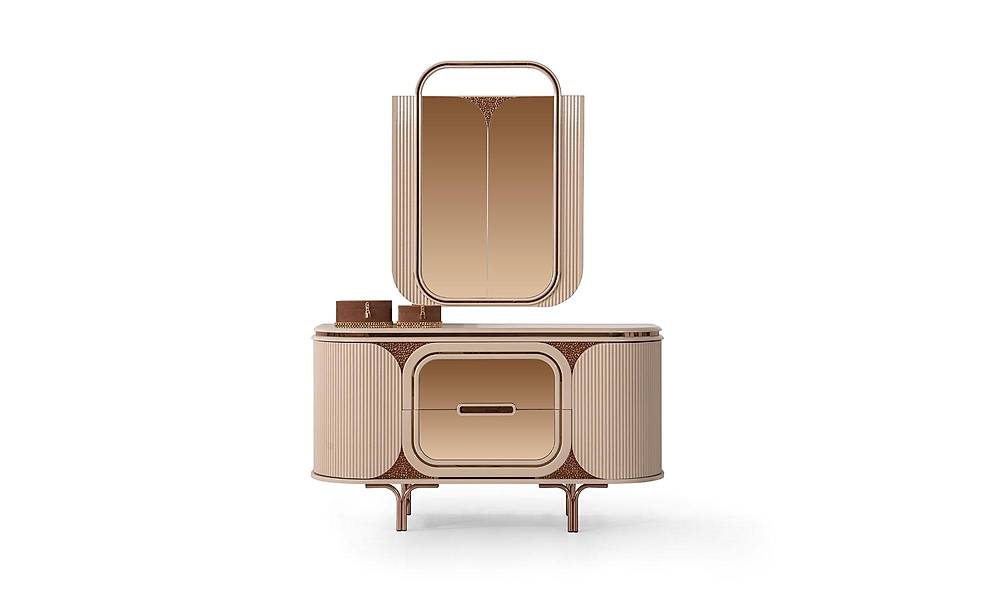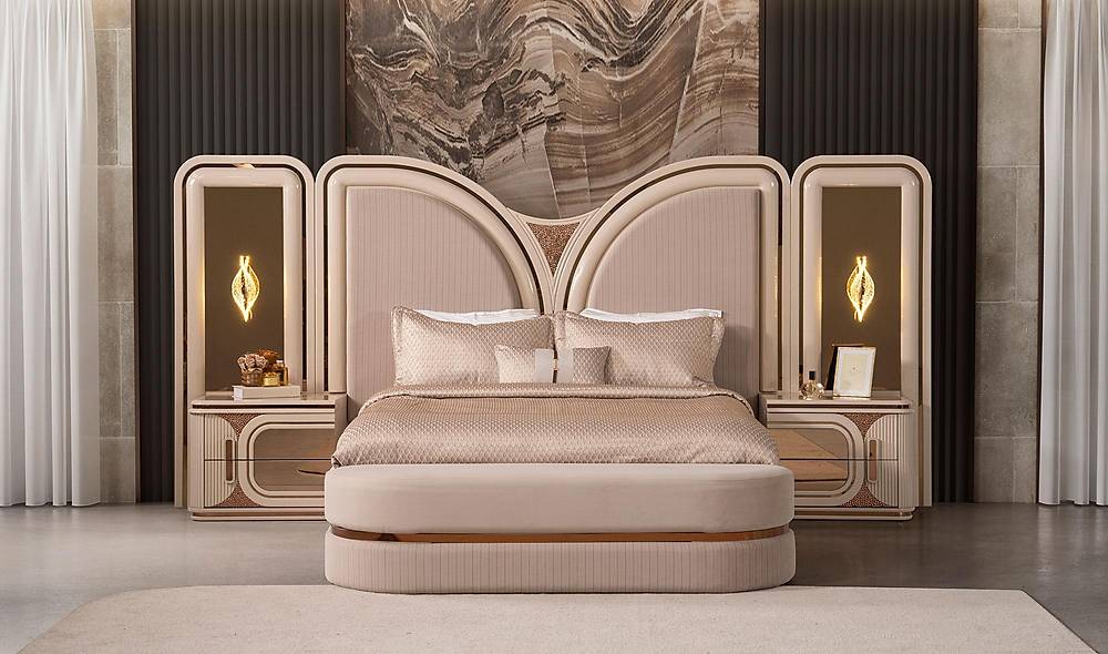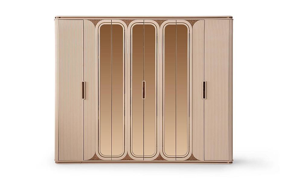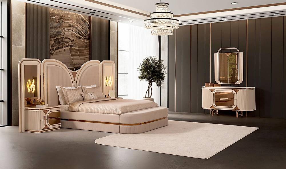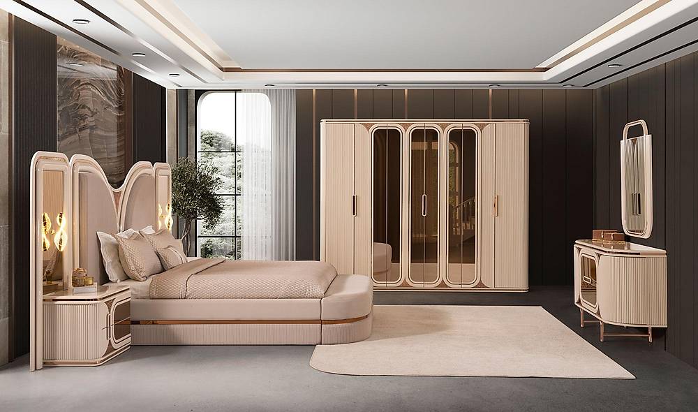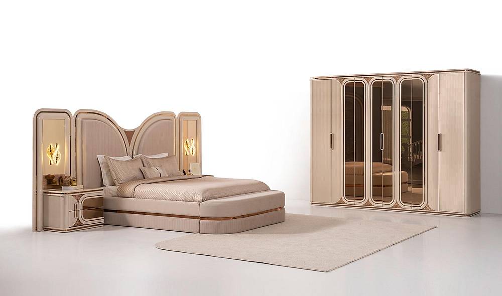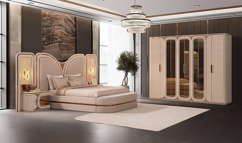 Ervaar luxe, slimme opbergruimte en tijdloos design in één: de French Door Art slaapkamercollectie combineert een bronzen spiegelfront met een zachte, wolvrije fluweel-koptekst en royaal interieur — ontworpen om jouw slaapkamer om te toveren tot een rustgevende, georganiseerde en stijlvolle plek. Met een solide afwerking in beige, hoogwaardige materialen en een 2 jaar garantie, geniet je van zowel schoonheid als zekerheid. Levering is beschikbaar in heel Europa en wereldwijd.