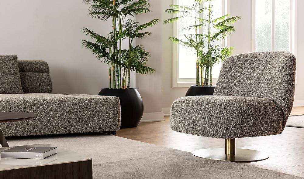 Moderne draaibare fauteuil met zachte zit en hoogwaardige 35 HR-schuim voor uitzonderlijk comfort. Kies uit linnen, fluweel of nubuck en pas de kleur aan voor perfecte interieurafstemming.