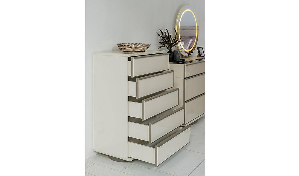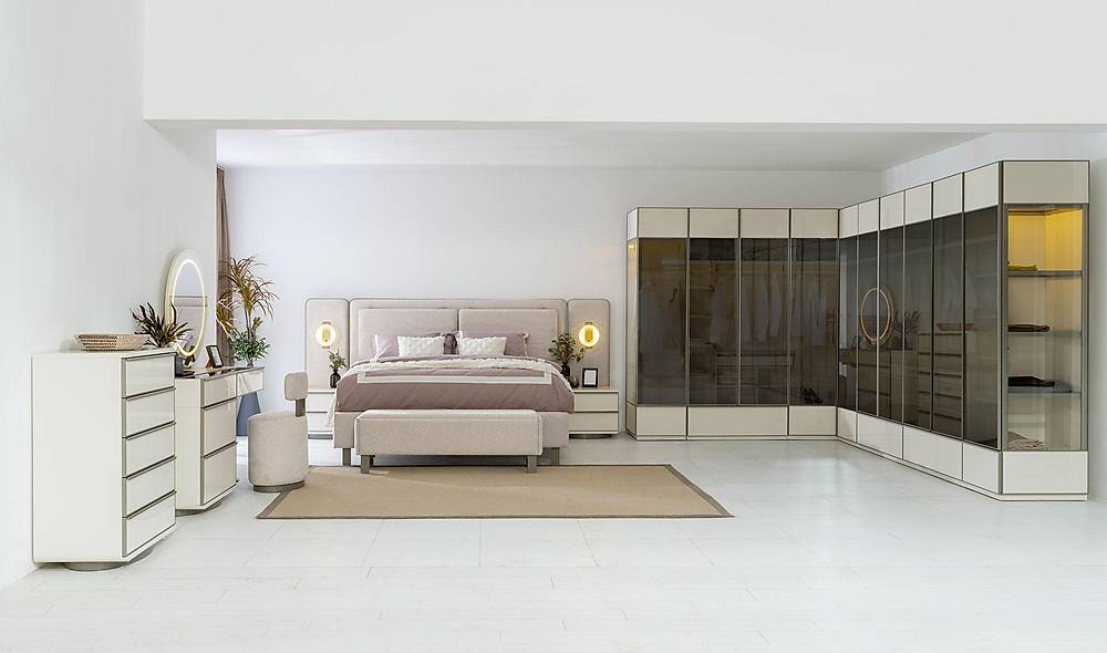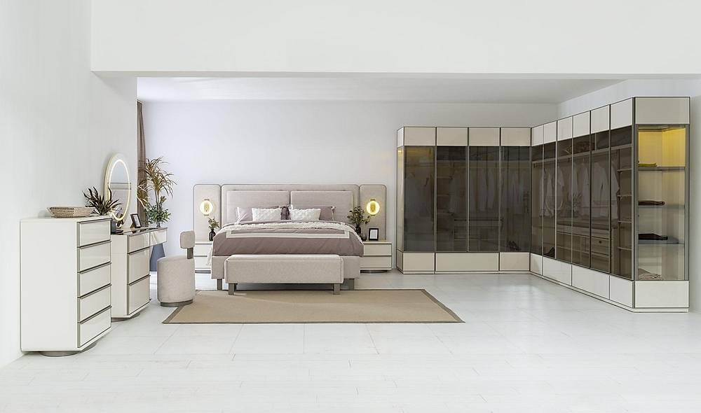 - Kast met reflecterend glas dat diepte en glamour toevoegt aan je slaapkamerinterieur.