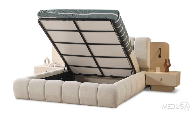 Een gestoffeerd bedframe voor een 160×200 cm matras, afgewerkt met eersteklas stof. Perfect voor wie luxe uitstraling en eenvoudig onderhoud waardeert.