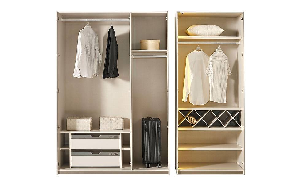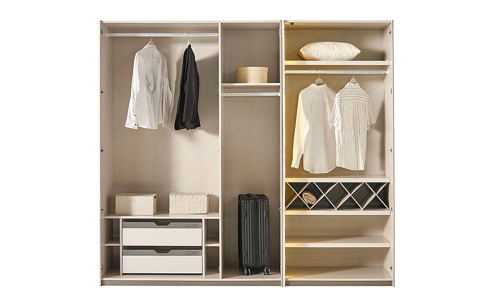 - Alles-organizer: kastindeling met kledingstang, legplank, lade en handige opbergfunctie in de bedbodem (bazale karyola).