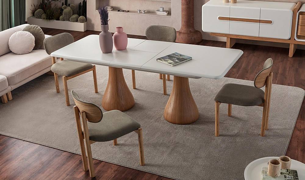 - Doordachte functionaliteit: de eetkamertafel is midden-uitklapbaar, zodat u flexibel kunt schuiven tussen compacte en ruime opstellingen zonder in te leveren op stabiliteit.