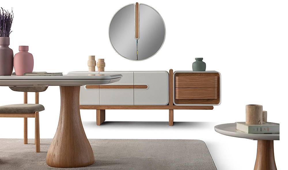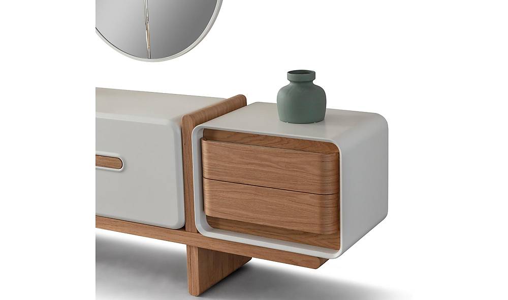 - Handige details: de kasten hebben een stoppermechanisme voor veilige en gecontroleerde sluiting; het dressoir heeft meerdere deuren en lades voor praktische bergruimte.